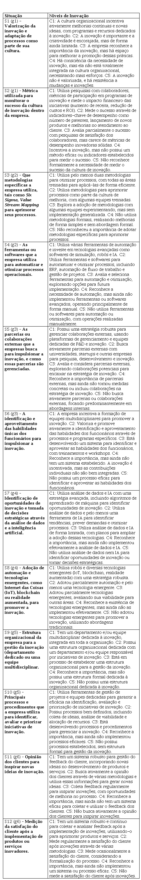 De modo a explicar os quesitos pode-se citar a Situação 1 (g1) - Valorização da inovação e adaptação de processos como parte de sua cultura. E havia cinco possibilidades de respostas, sendo a primeira referente ao referente ao primeiro nível de inovação, isto é, nível avançado (C1) “Sim, a cultura organizacional incentiva ativamente a busca por melhorias contínuas e a exploração de novas ideias para aprimorar processos e produtos. Existem programas e recursos dedicados à promoção da inovação e da adaptação de processos.”; A segunda opção, referente ao nível gerenciado (C2) “Sim, a inovação é uma parte importante da cultura da empresa. Encorajamos a criatividade e a busca por soluções inovadoras para enfrentar os desafios em nossas operações, mas ainda de forma limitada.”; A terceira opção, referente ao nível intermediário (C3) “Em certa medida, a empresa reconhece a importância da inovação e da adaptação de processos, embora haja espaço para melhorias na promoção dessas práticas.”; A quarta opção, referente ao nível básico (C4) “A empresa está ciente da necessidade de inovação e adaptação, mas esses aspectos não são totalmente integrados na cultura organizacional. Poderia haver mais esforços para fomentar uma mentalidade inovadora.”; E, por fim, a última opção, nível convencional (C5) “Não, a empresa ainda não valoriza a inovação a adaptação de processos, e existe uma resistência a mudanças e inovações”. Nas demais situações a interpretação dos quesitos segue esta mesma lógica.