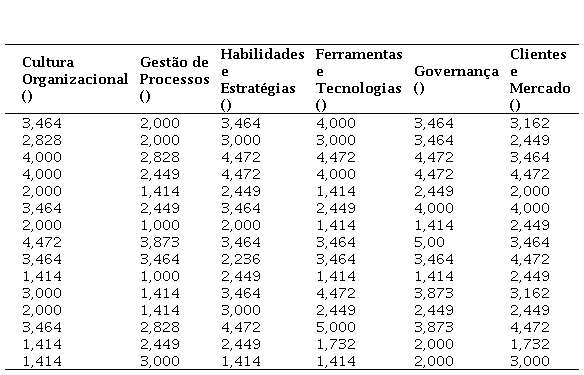 Ao obter todos os dados e preencher a planilha, que foi estruturada como ferramenta de avaliação de maturidade de inovação em processos de empresas industriais, seguiu-se os cinco passos. E assim, encontrou as relações de preferência do método, para cada alternativa, sendo apresentadas na Tabela 8.