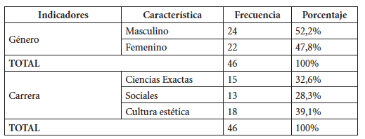 Los datos se tomaron durante mayo del período académico abril-agosto 2016-I. En el estudio participaron 46 estudiantes de tres carreras de la Facultad de Ciencias de la Educación de la UNACH. Un 52% de los estudiantes pertenecen al género masculino mientras que el 47% se identifican con el género femenino. En relación a la carrera que estudian, el 32,6% pertenece a Ciencias Exactas, el 28,3% a Ciencias Sociales y el 39,1% a Cultura Estética. Estos datos se pueden visualizar en la Tabla 1.