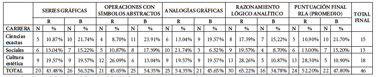Este resultado se puede entender ya que los estudiantes de Ciencias Exactas por la naturaleza la carrera, trabajan varias asignaturas y desde los primeros semestres, con herramientas del pensamiento como análisis, síntesis, imaginación espacial, reconocimiento de patrones, símbolos abstractos e hipótesis, que requieren demostraciones matemáticas, proposiciones y cuantificadores. Por otro lado, los resultados más homogéneos de los estudiantes de Cultura Estética fueron en series gráficas y analogías gráficas, debido a las características de su profesión, en la que reciben asignaturas relacionadas con el dibujo y el arte. También se puede deducir que a los estudiantes de Ciencias Sociales y Cultura Estética les falta desarrollar el razonamiento inductivo y deductivo, procesos a través de los cuales se realizan inferencias, que son necesarias para potenciar el razonamiento lógico analítico.