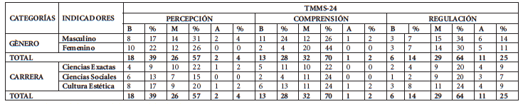 o demasiada percepción emocional. Los datos obtenidos se distribuyen en la curva normal; en el caso de la percepción con una media de 25,54 y la desviación estándar de 5,76; en la comprensión con una media de 25,66 y la desviación estándar de 6,37 y en el caso de la regulación con una media de 30,79 y la desviación estándar de 6,28. Las puntuaciones obtenidas en todas las dimensiones se ubican en la categoría de adecuada percepción, comprensión y regulación emocional respectivamente. De las 22 (48%) estudiantes del género femenino, en el factor de percepción, 10 (22%) se ubicaron con baja percepción emocional, 12 (26%) con buena o adecuada percepción emocional y no existen estudiantes con alta percepción emocional. En cuanto al factor de comprensión emocional, 2 (4%) asumen baja comprensión, a la vez que 20 (44%) buena o adecuada y tampoco existen estudiantes con alta comprensión emocional. Finalmente, en el factor de regulación emocional, los datos indican que 3 (7%) estudiantes obtienen baja regulación emocional, 14 (30%) alta regulación y 15 (33%) alta o demasiada percepción emocional. Los resultados del género femenino se ubican en la curva normal. Para la prueba de percepción, con una media de 25,68 y una desviación estándar de 4,83; en la comprensión con una media de 27,7 y una desviación estándar de 3,69 y en el caso de la regulación con una media de 29,45 y una desviación estándar de 5,68.