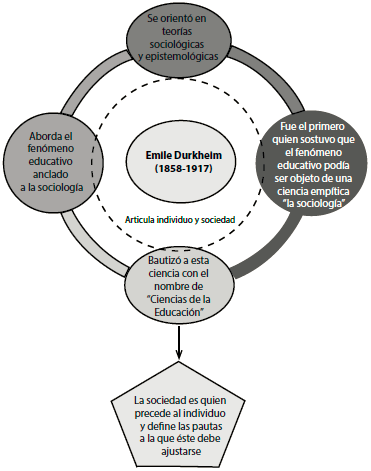 De acuerdo con los razonamientos realizados, el pensamiento de Durkheim va desde la teoría y la práctica docente, y aborda el fenómeno educativo anclada a la sociología, por lo que, será la sociedad la que considere a los individuos para la construcción del saber. Así la sociedad es la que precede al individuo y define las pautas a la que debe ajustarse asumiendo realidades y contextos que implican aspectos como creencias y valores.