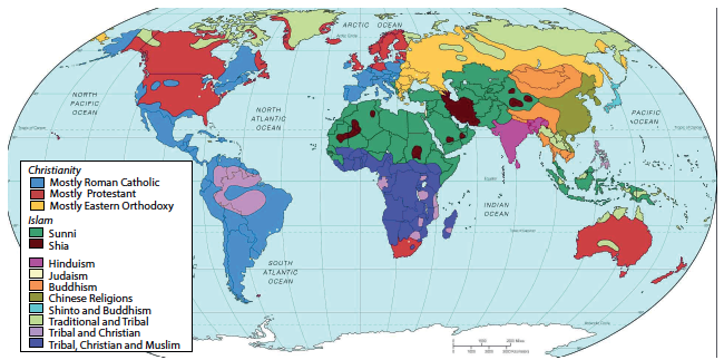 Ciertamente, este mapa supone una reducción de las 4 200 religiones estimadas por Shouler (2010) y los investigadores independientes de adherents.com, pero al mismo tiempo nos sirve para reconocer e identificar las creencias religiosas más practicadas en la actualidad: el cristianismo, el islamismo, el hinduismo, el budismo y la religión tradicional china. Llama la atención como los países colonizadores han impuesto su cuadro epistémico religioso en sus respectivas colonias, como es el caso de los cristianos católicos en casi toda Sur América, Centro América y gran parte de Norte América por la hegemonía de españoles y portugueses en gran parte del territorio. También es el caso del protestantismo en las antiguas colonias británicas de Norte América, Sudáfrica, Australia y Nueva Zelanda. Bajo esta lógica de imposición epistémica también destacan los países satélite de la antigua Unión Soviética, que practican la vertiente cristiana ortodoxa en su mayoría. Resulta muy llamativa la zona meridional del continente africano, donde conviven diferentes corrientes musulmanas, cristianas y tribuales, que explica en gran medida el aumento del número de refugiados y desplazados en estos países por la alta conflictividad étnico-religiosa actual. La influencia islámica está patente en la zona septentrional de África, Oriente Medio y gran parte del sudeste asiático. En Asia encontramos el hinduismo como cuadro epistémico religioso preponderante en cuanto a número de seguidores, mientras que en el budismo se expande por un gran número de países asiáticos. La religión tradicional china también tiene un fuerte peso en el área. Pero lo que llama positivamente la atención son las zonas más tropicales de Australia y las zonas de selva amazónica en Sur América, que conservan un fuerte arraigo tradicional y tribuales de las cosmovisiones de los pueblos originarios.