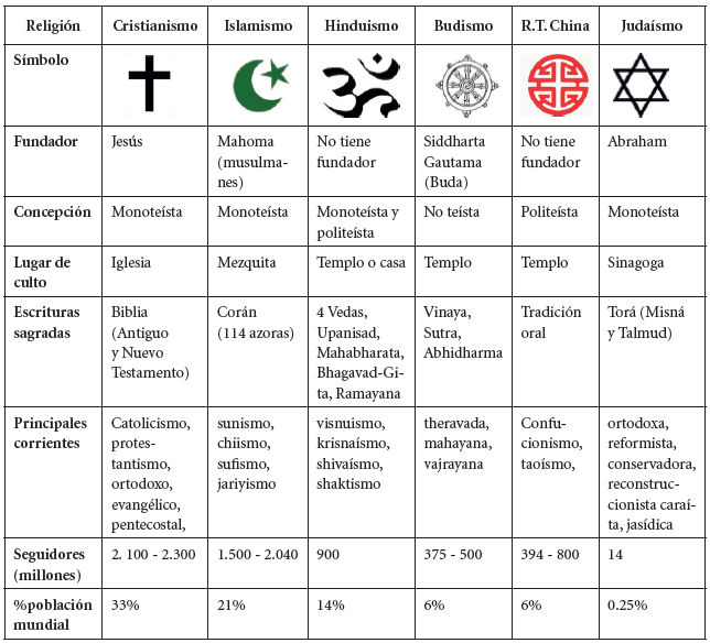 Buscando complementar la información del mapa 1, se ha elaborado la tabla 1 para hacer una comparación interreligiosa de las estructuras epistémicas paradigmáticas que constituyen las doctrinas filosóficas y religiosas más practicadas e influyentes en la actualidad. A pesar de no tener una gran preeminencia en el mapa, también se incluye el judaísmo por su fuerte reseña histórica, puesto que de ella se desglosaron el cristianismo y el islamismo, que son practicadas por más de la mitad de la ciudadanía mundial. La intención es crear un meta-punto de reflexión para poder concebir con mayor claridad este espacio ético y espiritual global que Kauffman (2008), Küng y Kuschel (2006) demandan, puesto que todas estas interpretaciones de la realidad natural y del cosmos parecen converger en muchos aspectos, como se detalla más adelante en la figura 2.