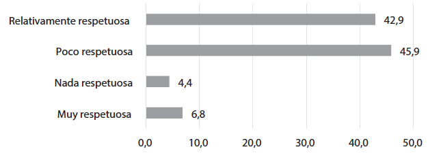 Se observa claramente que, de acuerdo al testimonio de los estudiantes, el respeto y la tolerancia por la diversidad religiosa siguen siendo valores cuya promoción y/o fomento es relativamente bajo, situación que resulta escandalosa en el contexto de país que optó por la democracia y en donde los valores de la libertad, la igualdad, la diversidad y el respeto por la diferencia se constituyen en los garantes de la convivencia pacífica. No obstante, pese a la pregunta, es importante señalar que quienes participan en la encuesta dan a conocer su experiencia en el asunto partiendo del contexto regional en el que se ven inmersos, donde, como se observó en un principio, la mayor parte de la población afirma pertenecer al catolicismo.
