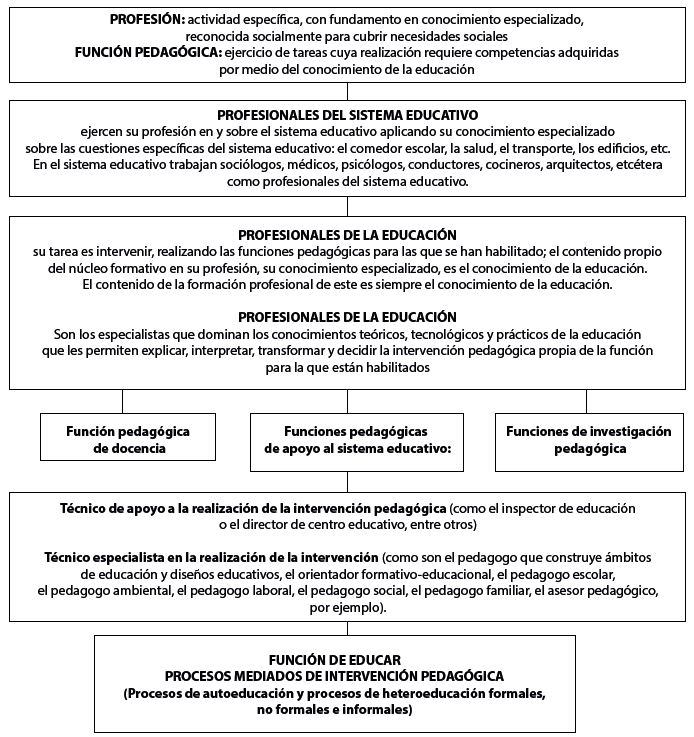 En el sistema educativo trabajan sociólogos, médicos, psicólogos, y otros profesionales que reciben con propiedad la denominación de profesionales del sistema educativo, porque ejercen su profesión en y sobre el sistema educativo. Pero, además, existe un grupo de profesionales del sistema educativo que merecen con propiedad la denominación de profesionales de la educación; su tarea es intervenir, realizando las funciones pedagógicas para las que se han habilitado; el contenido propio del núcleo formativo en su profesión es el conocimiento de la educación. ‘Profesionales del sistema educativo’ y ‘profesionales de la educación’ son dos expresiones distintas con significado diferente; y tiene sentido afirmar que, no todo profesional del sistema educativo es profesional de la educación, en tanto en cuanto solo el contenido de la formación profesional de este es siempre el conocimiento de la educación. Profesional de la educación es el especialista que domina los conocimientos teóricos, tecnológicos y prácticos de la educación que le permiten explicar, interpretar y decidir la intervención pedagógica propia de la función para la que está habilitado.