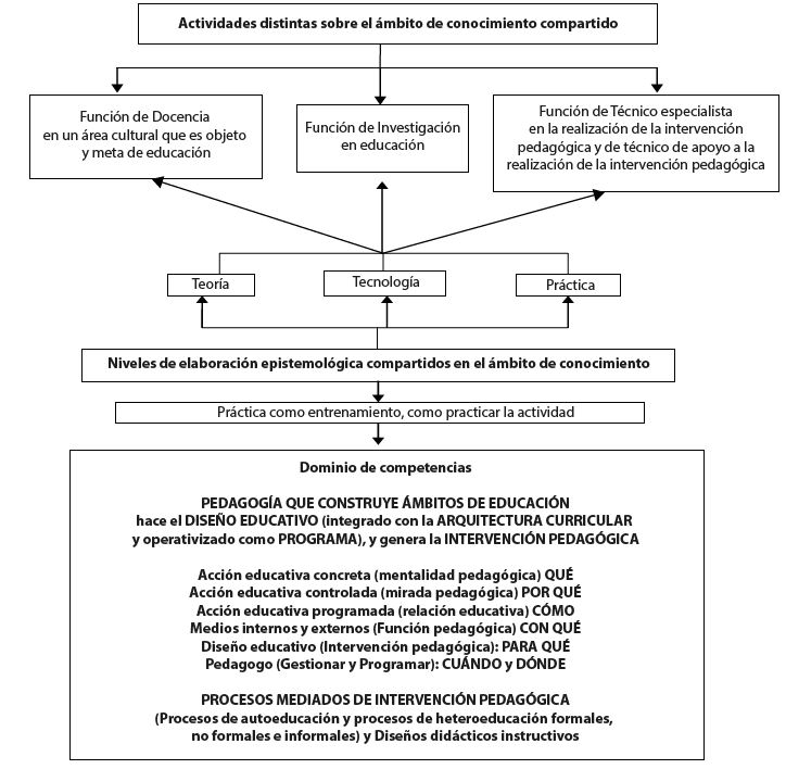 En rigor lógico, hay que aceptar que el conocimiento de la educación es, pues, un conocimiento especializado que permite al especialista explicar, interpretar y decidir la intervención pedagógica propia de la función para la que se habilita, bien sea función de docencia, bien sea de apoyo al sistema educativo, o bien sea función de investigación.