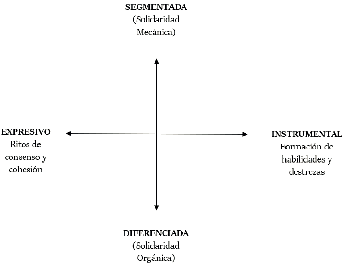 En este sentido, la sociología durkhemiana le proporciona una base para vincular las dinámicas escolares y sociales, o bien, cómo las transformaciones de la organización social modifican las dinámicas en la escuela. A partir de lo anterior, es preciso señalar que las categorías instrumental y expresivo son modelos de transmisión de relaciones sociales en la escuela que no se excluyen mutuamente sino se entrelazan de manera compleja en la práctica educativa y se basan en las nociones de solidaridad orgánica y mecánica.