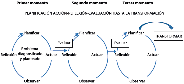 Para Krause (2002), la IAP “sigue una espiral introspectiva y emancipadora: una espiral de ciclos de planificación, acción, observación sistemática, reflexión, y luego una replanificación que dé paso a nuevas observaciones y reflexiones” (p. 48). Latorre (2005) refiere que diferentes investigadores han descrito los ciclos de acción reflexiva para mejorar la práctica, en forma de diagrama de flujo o espirales de acción. Una propuesta interesante es la planteada por Naranjo et al. (2019) quienes adaptaron la espiral de ciclos del método de la IA, a partir de Carr y Kemmis (1988), e incluyeron los momentos que se requieren hasta lograr los cambios esperados o la transformación: