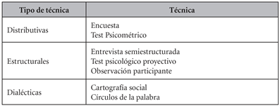 Una vez identificados los agentes potenciales, los antagónicos, las redes de apoyo y los principales dilemas vividos por la comunidad, se inició el diseño de las técnicas de investigación para identificar los problemas y las potencialidades, en atención a la salud integral. Alberich (2008) refiere que existen técnicas de investigación distributivas (cuantitativas), estructurales (cualitativas) y dialécticas (participativas). El cuerpo de investigación aplicó las técnicas expuestas en la tabla 1.