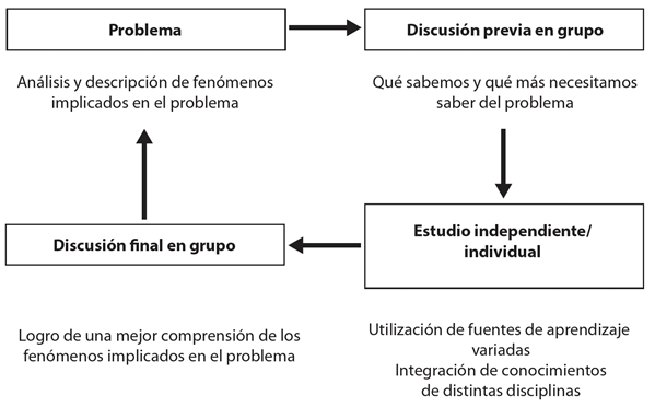 Desde esta estrategia, el docente en tanto tutor o guía presenta un problema al estudiante para que lo vaya resolviendo con su grupo de trabajo. Juntos se encargan de investigar, leer y consultar para poder llegar a una solución o al menos para lograr una comprensión mejor de la cuestión analizada. Después, se reúnen para poder discutir sus resultados y así cumplir con la actividad encargada por el docente. Este es un modo efectivo de desarrollar el pensamiento crítico. La figura 1 ilustra lo anterior.