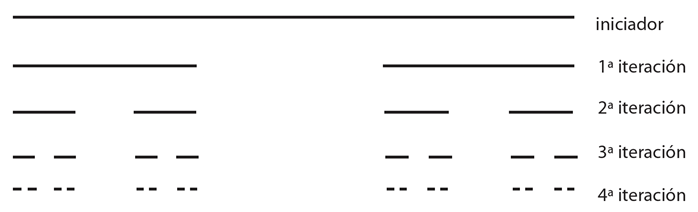 Primer paso. Sea una línea que luego ha de ser partida en tres. Enseguida, se borra el segmento central. Esta es la primera iteración.