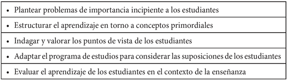 Otro supuesto del constructivismo es que los profesores no deben enseñar en el sentido tradicional de dar instrucción a un grupo de estudiantes, sino que más bien deben estructurar situaciones en las que los estudiantes participen de manera activa con el contenido a través de la manipulación de los materiales y la interacción social (Schunk, 2012, p. 231).