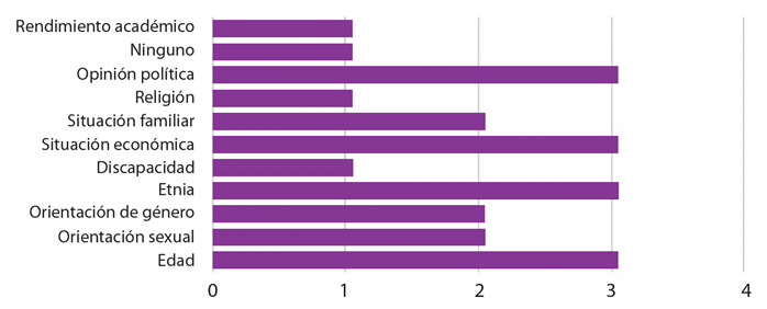 Por otra parte, se estableció que un grupo de estudiantes reconocen haber ejercido acciones discriminatorias y raciales contra sus compañeros de aula, docentes, estudiantes de otros semestres, autoridades y hacia personal administrativo de la institución (10 %). El foco se ubica en quienes son considerados diferentes sea por su origen étnico, situación socioeconómica, orientación sexual, género, diferencias generacionales, creencias religiosas, posición política o por presentar alguna discapacidad. Aquello demuestra que las manifestaciones de racismo y discriminación no están relacionadas con el rol que cumplen dentro de la institución, sino más bien constituye un problema que proviene del entorno familiar-social que se reproduce en los escenarios universitarios.