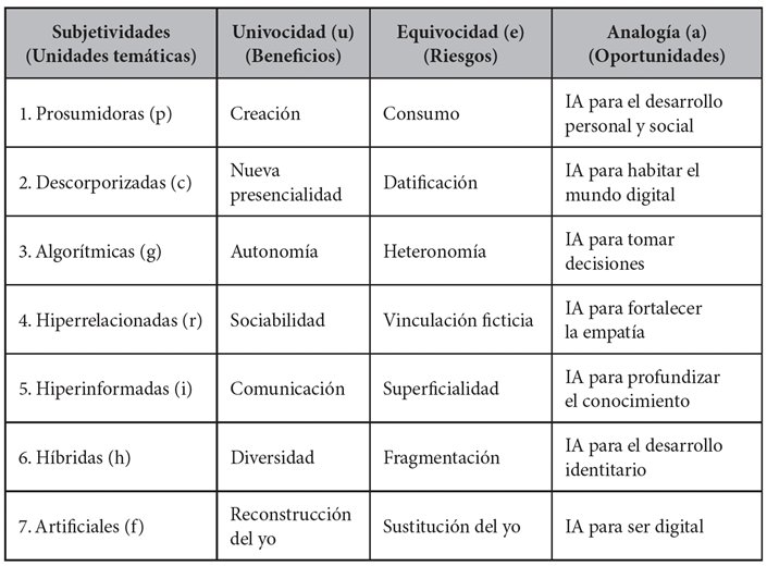 Los resultados se estructuran a partir de las siete unidades temáticas emergentes, correspondientes con los siguientes apartados, su presentación descriptiva se desarrolla entre las voces utópicas o unívocas (u) y aquellas distópicas o equívocas (e), y se cierra con las voces analógicas (a), las cuales sintetizan el equilibrio o phronesis del impacto de las IA en las subjetividades.