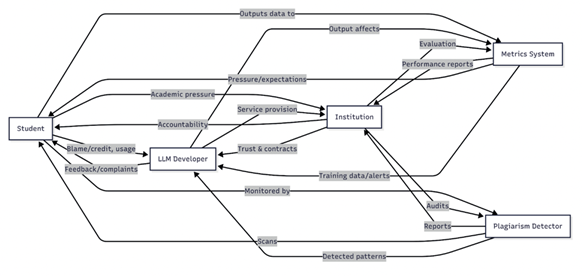 Cuando el ensayo se marca posteriormente como “asistido por IA”, la culpabilidad se dispersa por toda esta red. ¿El estudiante es un tramposo o simplemente un usuario oportunista de una herramienta con licencia del campus? ¿Son los desarrolladores los responsables de lanzar un producto que puede superar en escritura a los estudiantes universitarios? ¿Debería el profesor haber exigido defensas orales para verificar la autoría? Ningún nodo puede atribuirse de forma creíble la responsabilidad total del resultado, lo que demuestra la observación de Latour (2005) sobre cómo la acción pertenece a un conjunto y nunca a un sujeto.