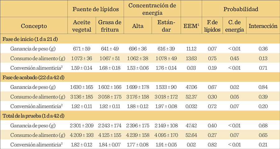 Las variables estudiadas fueron: promedio de ganancia de peso vivo, promedio de consumo de alimento y conversión alimenticia (consumo/ganancia); estas variables se analizaron estadísticamente en cada fase de alimentación, es decir, iniciación (1 d a 21 d), acabado (22 d a 42.d) y total de la prueba (1 d a 42 d). El análisis de varianza se realizó en un diseño completamente al azar con arreglo factorial 2 x 2. No se observó efecto (P > 0.05) en la interacción entre la fuente de lípidos y concentración energética de la dieta, y por lo tanto solo los efectos principales son estudiados. En todos los casos se consideró significancia a nivel de 0.05. Los análisis estadísticos se realizaron en el paquete estadístico SAS.