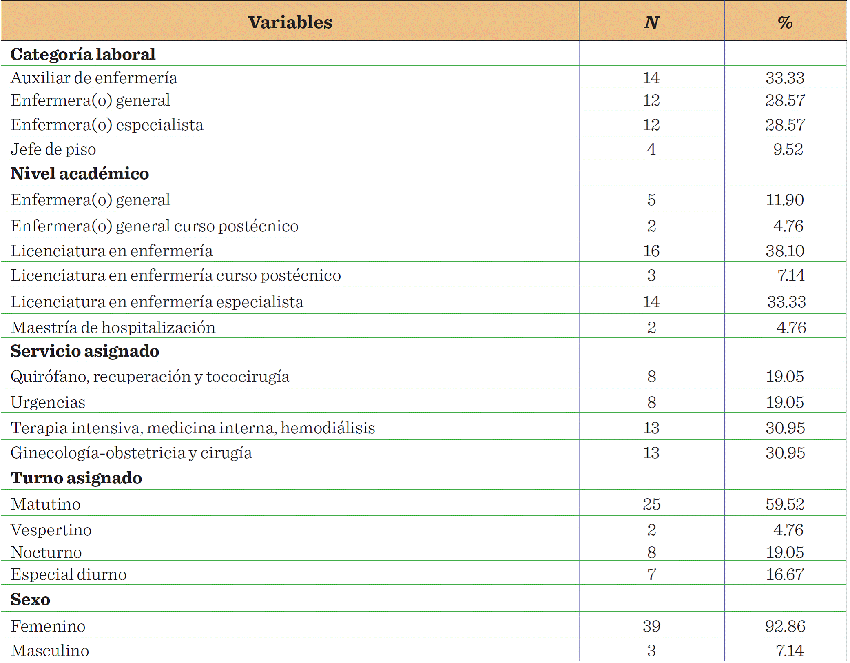 La edad promedio del personal de enfermería era de 40.9 años, predominando la categoria laboral de auxiliar de enfermería (33.33 %); el nivel académico que destacó fue el de licenciatura en enfermería (38.10 %); los servicios de terapia intensiva, medicina interna, hemodiálisis y ginecología-obstetricia y cirugía fueron los que despuntaron (30.95 %, respectivamente), así como el turno matutino (59.52 %) y el sexo femenino (92.86%) (Tabla 1).
