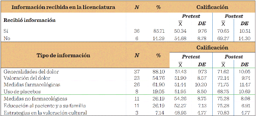El 85.71 % del personal de enfermería recibió información del dolor durante sus estudios de enfermería. El tipo de información proporcionada que predominó fue referente a generalidades del dolor (88.10 %) y medidas farmacológicas (61.90 %), y aunque esta variable no se asumió como independiente, si se evaluó como característica de la población y por su papel interviniente en los resultados al evaluar la intervención educativa, toda vez que se constató, que el personal que recibió información durante sus estudios de enfermería obtuvo mayor calificación en el postest (pretest: