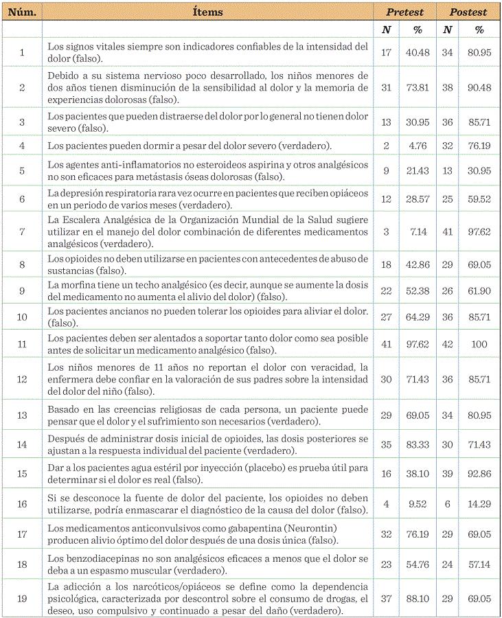 Posterior a la intervención educativa en el personal de enfermería, se observó un incremento de la media del conocimiento del pretest al postest (Tabla 3). Es decir, en la primera sección del instrumento, con respuestas de falso y verdadero, 16 ítems de los 19 (ítems 1, 2, 3, 4, 5, 6, 7, 8, 9, 10, 11, 12, 13, 15, 16 y 18) presentaron incremento en las respuestas correctas posterior a la intervención educativa; de éstos, 4 ítems mostraron los porcentajes más altos en el postest: 2. Debido a que su sistema nervioso está poco desarrollado, los niños menores de dos años tienen disminución de la sensibilidad al dolor (90.48 %); 7. La Escalera Analgésica de la Organización Mundial de la Salud sugiere utilizar en el manejo del dolor combinación de diferentes medicamentos analgésicos (97.62 %); 11. Los pacientes deben ser alentados a soportar tanto dolor como sea posible antes de solicitar un medicamento analgésico (100 %); 15. Dar a los pacientes agua estéril por inyección (placebo) es prueba útil para determinar si el dolor es real (92.86 %) (Tabla 4). A los ítems se aplicó z de proporciones, y al comparar el pretest y el postest resultaron 9 no significativos: 5, 9, 11, 12, 13, 14, 16, 17 y 18; y 5 de mayor significación: 4 (- 6.667 3), з (-5.085 5), 15 (- 5.273 3), 1 (- 3ľ800 9) у 19 (-2.133 5). Los ítems rela-Clonados con el uso de analgésicos opiáceos (14 y 19), así como la valoración y suministro de los mismos (17, 23, 28 y 29) mostraron un decremento de sus valores en el postest, aunque solo fue significativa para los ítems 19 y 29.