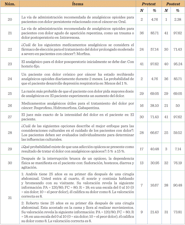 La Tabla 5 muestra que en la segunda sección del instrumento con ítems de opción múltiple, siete preguntas de las 12 que integran esta sección (ítems: 21, 22, 24, 26, 27, 30, 31), posterior a la intervención educativa, presentaron incremento en las respuestas correctas; así mismo, 4 ítems presentaron los porcentajes más altos de respuestas correctas: 21. La vía de administración recomendada de analgésicos opioides para pacientes con dolor agudo de aparición repentina, como un trauma o dolor postoperatorio es: Intravenosa (97.62 %); 23. El analgésico para el dolor postoperatorio inicialmente se debe de suministrar: con horario fijo (95.24 %); 27. El juez más exacto de la intensidad del dolor en el paciente es: El paciente (97.62 %); y 31. En lo referente a la valoración del dolor (caso 1 tuvo la mayor puntuación: 90.48 %).