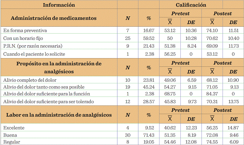 En el pretest, en relación a la opinión del personal de enfermería sobre el manejo del dolor, más de la mitad aplicaba los medicamentos con un horario fijo y consideraban que su labor en el alivio del dolor era "buena"; en el postest, aumentaron estas acciones en más de un 20 %.