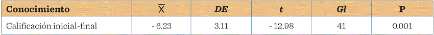 Para verificar la efectividad de la intervención educativa dirigida al personal de enfermería, se aplicó la prueba t para muestras relacionadas, al promedio de las diferencias de calificaciones inicial-final de las personas, resultando significativa (p < 0.001), como lo muestra la Tabla 7.