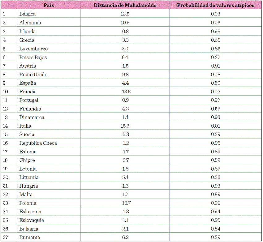 Un análisis detallado de los coeficientes reveló una gran similitud en la actividad de la economía social en Hungría (21) y República Checa (16) (con una distancia de 0.071), Malta (22) y Chipre (18) (con una distancia de 0.071). Otros países con pautas parecidas fueron Hungría (21) y Finlandia (12) (con una distancia de 0.073), Luxemburgo (5) y Malta (22) (con una distancia de 0.088), y Chipre (18) con Letonia (19) (con una distancia de 0.092). Los países más diferentes en cuanto a la actividad de economía social fueron Alemania (2) con Malta (22) (con una distancia de 53.981) y Alemania (2) con Letonia (19) (con una distancia de 52.285) (Tabla 13).