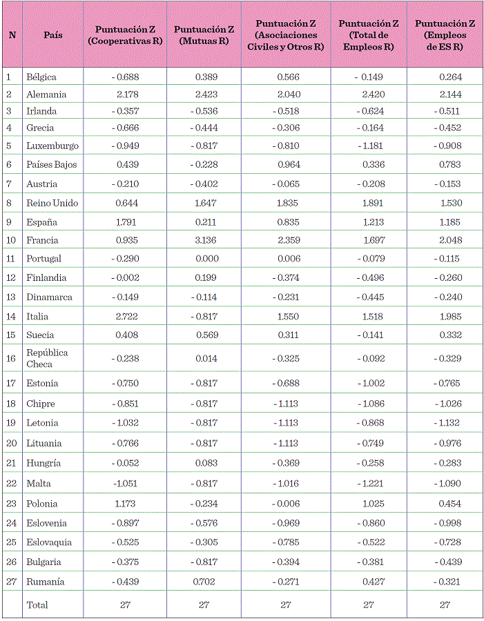 Los países de Europa fueron clasificados considerando el total de empleos (Z total de empleos R), número de empleos de economía social (Z empleos ES R), el número de cooperativas (Z cooperativa R), número de mutuas (Z mutuas R) y número de asociaciones civiles y otros (Z asociaciones civiles y otros R) (Tabla 12).