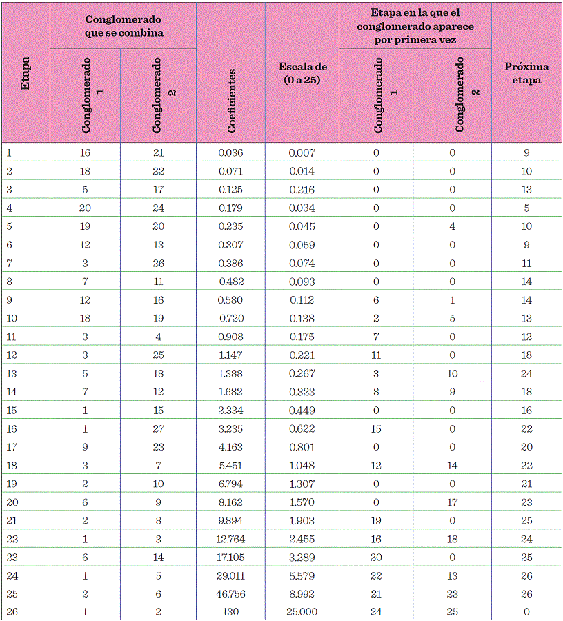 Se empleó el método de conglomerados jerárquicos, que se puede utilizar para variables cuantitativas y cualitativas, no se conoce el número de conglomerados a priori, y cuando el número de objetos no es muy grande el método jerárquico de análisis de cluster Ward, también conocido como "momento central de orden de dos" o "pérdida de inercia mínima", tiene como principal objetivo optimizar la varianza mínima intragrupal (Ward-Jr., 1963). Se determinó la medida de distancia, para este caso, distancia euclidea al cuadrado. En cada paso del proceso de agrupación se trató de combinar aquellos dos conglomerados que provoquen el menor incremento a la suma total de las distancias al cuadrado dentro de los conglomerados.