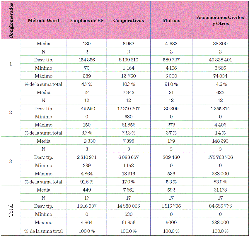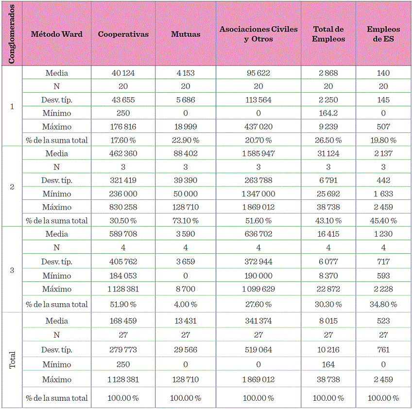 El conglomerado 1 destacó por tener más mutuas (91 %). El conglomerado 2 fue el que más cooperativas registró (72.3 %); pero también presentó el menor porcentaje de empleos de economía social (3.7 %), mutuas (3.7 %) y asociaciones civiles y otros (1.4 %). El conglomerado 3 destacó por tener más empleos de economía social (91.6 %), y más asociaciones сі-viles y otros (83.9%) (Tabla 7).