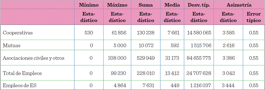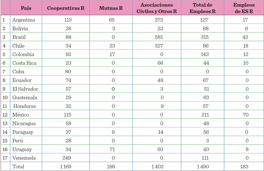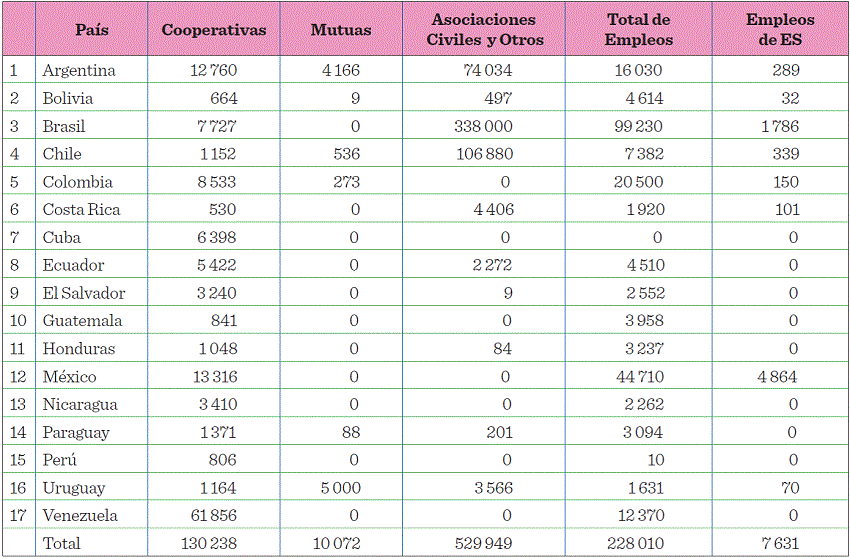 El análisis reflejó que el número de cooperativas en Latinoamérica osciló de 530 de Costa Rica a 61 856 de Venezuela, que proporcionó una media de 7 661 cooperativas. La media de empleos de economía social fue de 449 de una oferta laboral de 228 010 puestos (Tablas 2 y 3).