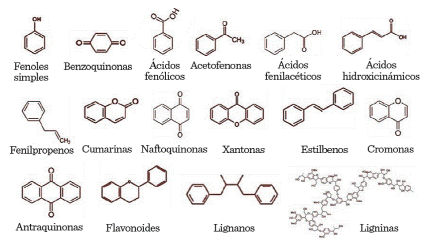 En la búsqueda de promover el bienestar y preservar la calidad del animal, sin comprómeter al medio ambiente y la salud de los consumidores, la investigación científica se ha enfocado en la evaluación de inmunoestimulantes y antioxidantes provenientes de fuentes naturales (Bulfon y col., 2013). En este sentido, los polifenoles presentes en frutas, verduras, legumbres, cereales y bebidas, como el té verde y el vino tinto, exhiben propiedades inmnuno-estimulantes y antioxidantes (Bulfon y col., 2013; Reverter y col., 2014; Vaseeharan y Tha-ya, 2014; Afzal y col., 2015; Shahidi y Ambi-gaipalan, 2015); estas últimas relacionadas directamente con propiedades antiestrés (Chakraborty y Hancz, 2011). Los polifenoles son compuestos que se derivan del metabolismo secundario de las plantas a través de la vía fenil-propanoide. La característica general de los polifenoles, es que tienen anillos aromáticos con grados de hidroxilación variable y la mayoría se encuentran en forma conjugada con uno o más restos de azúcares unidos a grupos hidroxilo o directamente al anillo aromático, incluso pueden encontrarse asociados a otros compuestos (Kumar y Pandey, 2013). La diversidad estructural deriva en una amplia gama de polifenoles (Figura 1) (Bravo, 1998).