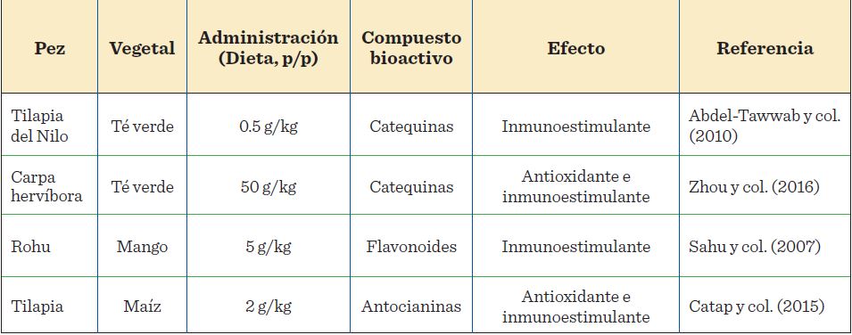 La utilización de vegetales, como fuentes de polifenoles en la dieta, puede reducir el estrés y mejorar el sistema inmune innato tanto de peces omnívoros, herbívoros (Tabla 1) y carnivoros; en estos últimos, se ha empleado el té verde [Camellia sinensis (L.) Kuntze], la granada (Punica granatum L.) y la cebolla (Allium cepa L.), entre otros (Harikrishnan y col., 2011; Nootashycol.,2013).