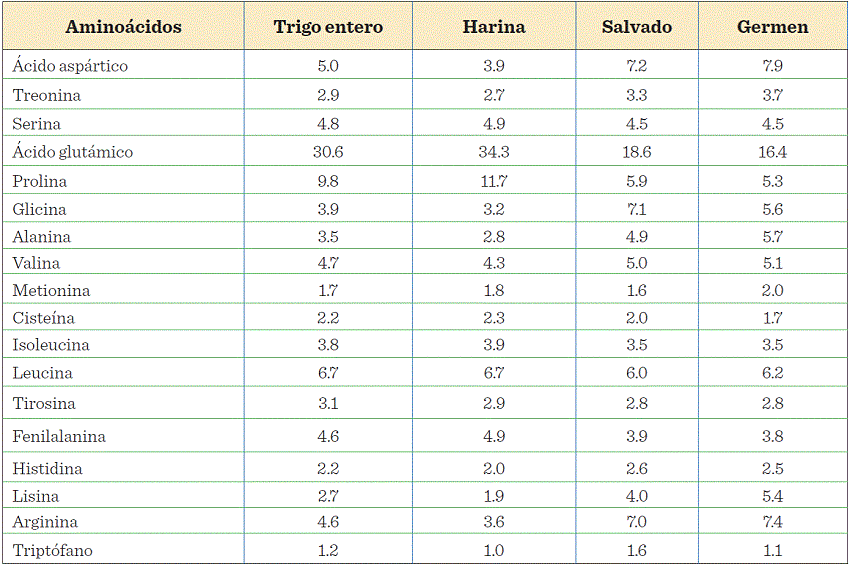 Las proteínas de salvado de trigo son de alta calidad nutricional, ya que presentan una composición balanceada y rica en aminoácidos esenciales como lisina (Lys), triptófano (Trp) y metionina (Met), los cuales son deficientes o limitantes en la harina de trigo (Shewry y col., 2009). Las proteínas de salvado tienen un contenido de Lys que es casi el doble del encontrado en la harina (Cornell, 2003; Shewry y col., 2009) y representa el 4.5 % del total de los aminoácidos del salvado (Corke, 2004); además, contienen arginina (Arg), alanina (Ala), ácido aspártico (Asp), glicina (Gly) y, en menor proporción, ácido glutámico (Glu), prolina (Pro) y fenilalanina (Phe), así como aminoácidos azufrados, como la cisteína (Cys) (Apprich y col., 2014; De-Brier y col., 2015). En la Tabla 2 se muestra la composición de aminoácidos del grano de trigo y de las principales fracciones de la molienda, destacándose el contenido de 5 aminoácidos esenciales (histidina, lisina, treonina, valina y triptófano), el cual es mayor en el sa!vado que en la harina (Shewry y col., 2009).