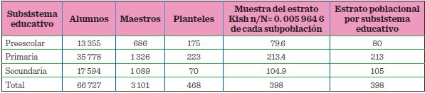 Se tuvo acceso a las bases de datos de la Secretaría de Educación de Tamaulipas, para establecer el número total de planteles de educación primaria, y se eligió el muestreo probabilístico, mediante el cálculo del 10 %, a las poblaciones de los subsistemas de educación básica: preescolar, primaria y secundaria (Tabla 2).
