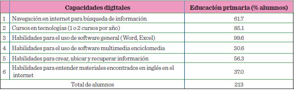 Si bien, las TIC abarcan un amplio espectro, como telefonía celular, computadora y tableta, entre otras, sin lugar a duda, lo que mayor impacto ha provocado es el internet, al ser una herramienta que favorece la interacción social, para buscar, obtener y procesar información, transformándola en conocimiento de modo eficiente. Las TIC pueden ser muy útiles en la práctica diaria de los alumnos de educación primaria, como lo demuestran los hallazgos de habilidades en el manejo de las TIC encontrados en los alumnos de este estudio (Tabla 6), que infieren que la presencia de las TIC se halla más extendida, con un 61.7 % en la capacidad de navegación en internet, para búsqueda de información; el 85.1 % de los alumnos recibió capacitación en el uso de las TIC, y casi el 100 % tenía habilidades en el manejo de software de uso general.