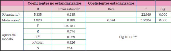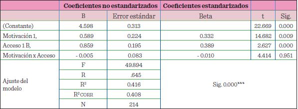 En la Tabla 8, se muestra la primera etapa del modelo de Van Dijk, en la que se pone a prueba el poder explicativo de la variable motivación, respecto a la variable acceso, donde el coefi ciente de determinación ajustado del modelo (R2 CORR) fue de 0.326, lo que indica que el modelo explica la generación de motivación en un 32.6 % aproximadamente, con una prueba F significativa de 104.123 (P = 0.000). Consecuentemente, este resultado corrobora la influencia de la motivación en el acceso de las TIC.