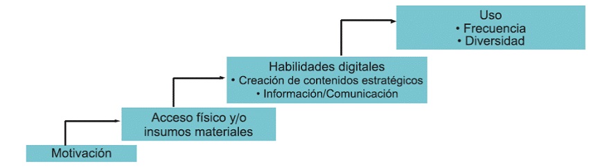 Se analizó la brecha digital en las primarias del estado de Tamaulipas, México, basándose en el modelo explicativo del acceso a las TIC, a partir de la propuesta teórica desarrollada por Van Dijk (2005), con el nombre de “Modelo de accesibilidad en etapas a la tecnología” (AET). Esta se compone de cuatro etapas sucesivas, iniciando con la motivación de los usuarios, el acceso, las habilidades digitales y el uso de las TIC (Van Dijk, 2012). El modelo de Van-Dijk (2012), llamado “Teoría del modelo de la apropiación de recursos tecnológicos” (Figura 1), establece que, una vez que se ha obtenido la primera etapa (estar motivado para usar las TIC), representado por la primer variable “motivación”, asociada a los estímulos dirigidos a los alumnos, para que usen los dispositivos y resultados que aportan las TIC (Van Dijk, 2005), sigue la segunda etapa: (acceso físico y material a las TIC), que genera la variable “acceso”; y se refiere a tener acceso a la computadora, periféricos e internet (Van Deursen y Van Dijk, 2014); luego seguiría la tercera etapa (desarrollo de las habilidades digitales), representada por la variable “capacidades”, asociada al grado de sofisticación de los dispositivos y programas de software usados, así como el fin y los resultados de los diferentes usos, entre otros (Van Dijk, 2012) y; finalmente, la cuarta etapa (uso o diversificación de la aplicación de las TIC), que genera la variable “uso”, y se refiere al tipo y la intensidad de la interacción con las TIC, pero también a la frecuencia y la diversidad de estos propios usos (Malmberg y Eynon, 2011; Van Deursen y Van Dijk, 2014).