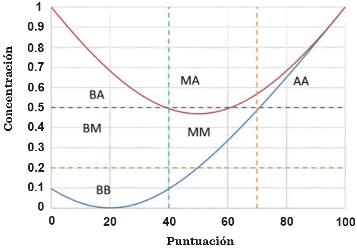 La distribución de las respuestas, están limitadas por las curvas P-C de la gráfica, en la que la variable dependiente es la concentración. En la Figura 1 se puede apreciar cómo se distribuyen las regiones, correspondientes a las combinaciones que se dan entre los aciertos y la concentración (bajo-bajo; alto-alto, medio-alto, por ejemplo). La organización y el análisis de los datos se obtuvo con la ayuda de software Excel. Cabe recordar que la concurrencia de uno o más puntos en la zona BB (bajo-bajo) indica aleatoriedad en las respuestas correspondientes al ítem en cuestión (Tabla 5). Es preciso aclarar que lo anterior no se refiere a la dispersión de los puntos, sino a la zona en la que están los puntos. En la Figura 1, para el puntaje de aciertos en la prueba, se usa una escala centesimal, cuyo equivalente decimal sería, por ejemplo, 0.1 = 10; .4 = 40; 1.0 = 100. Ello debido a que dicha escala es necesaria para que el software presente completamente los límites. En la Figura 2 se mantiene esta equivalencia y ya no es necesario usar la escala centesimal.