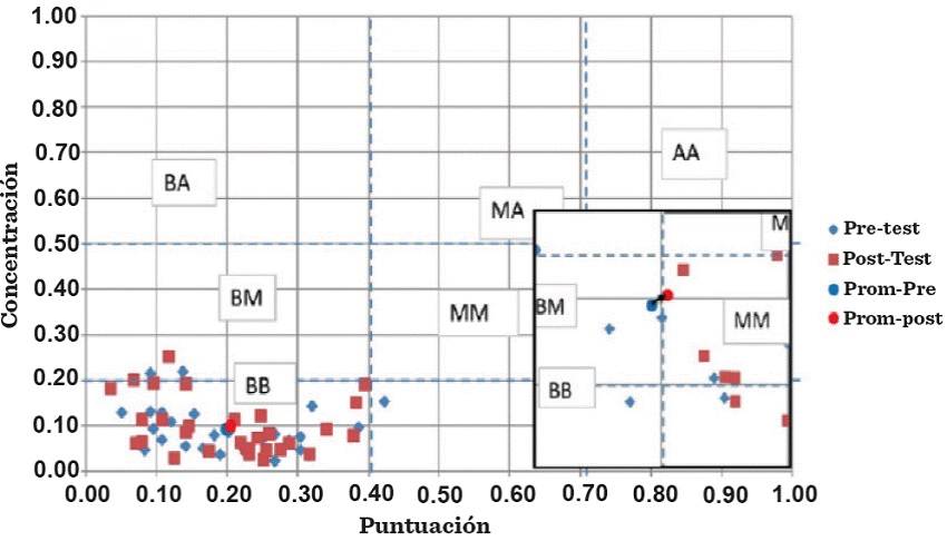 Como apoyo visual, se realizó un gráfico de dispersión (Figura 2), cuya variable dependiente es la concentración C y la variable independiente es la puntuación (o puntaje), P obtenidos en la pre y post-prueba. Los promedios de puntaje y concentración en la pre-prueba se ilustran por el círculo azul, ubicado en las coordenadas (0.196, 0.097); mientras que para la post-prueba se ilustran por el círculo rojo, ubicado en las coordenadas (0.202, 0.103), ambos en la zona BB. Ello muestra un pequeño recorrido hacia la zona BM, puesto que el ángulo entre los dos puntos es de 45° y la distancia entre los mismos es de 0.008 5 unidades, representado por el pequeño vector en negro, dentro del extracto, ubicado en la parte inferior derecha. Para ello, se tomaron las ecuaciones para calcular la pendiente m=(y2-y1)/(x2-x1) y la distancia entre dos puntos dAB= √ (x2-x1)2+(y2-y1)2. El recuadro de la misma figura es un extracto de la zona en la que se encuentran dichos puntos, para facilitar un poco su ubicación por parte del lector. Lo que es indicativo del paso de un modelo de respuesta, a la posibilidad de dos modelos, aunque aún incorrectos, presumiblemente debido a la instrucción. Además, se calculó el factor de Hake promedio con los factores de cada grupo. El resultado de dicho cálculo cae en la zona baja con G=0.000 1, lo que indica una baja ganancia en el aprendizaje del concepto de fuerza.