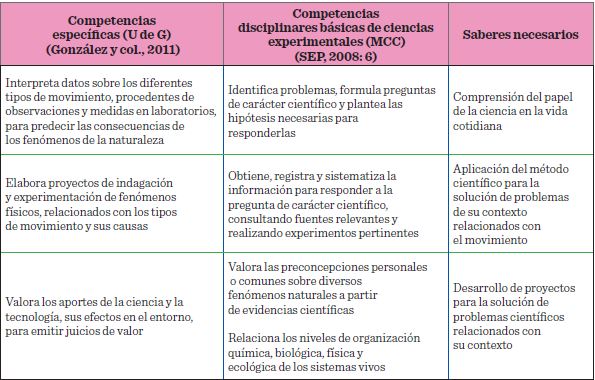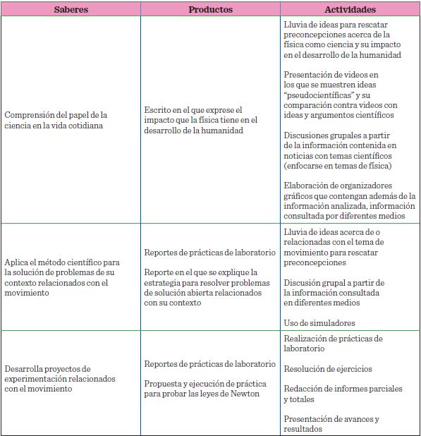Las estrategias que incorpora la Academia de Física (AF) de la Escuela Preparatoria de Tonalá (EPT), en su planeación académica, se sustentan en las presentadas en metodologías basadas en el aprendizaje activo de la física, en concordancia con el modelo educativo del SEMS (2009). Para esto, los docentes de la AF se dieron a la tarea de identificar las actividades y productos que ayuden a desarrollar y evidenciar las competencias, que marca el programa de curso vigente. La identificación de saberes necesarios para el desarrollo de competencias constituye el primer paso para ello (Tabla 1). El segundo, es la definición de actividades y productos esperados de aprendizaje (Tabla 2). Así, el aprendizaje orientado a proyectos a través del diseño de experimentos para probar leyes y/o principios de la mecánica, el aprendizaje basado en problemas con el uso de problemas de solución abierta, la escritura de ensayos y artículos con temas científicos, la formulación de hipótesis y su puesta a prueba mediante el desarrollo de prácticas de laboratorio, el trabajo con simulaciones, la solución de ejercicios de lápiz y papel, la comparación de videos con ideas científicas, contra videos con ideas pseudocientíficas, son una alternativa que puede lograr mejores resultados en comparación con el método de transmisión/recepción (De-Miguel, 2005; Galeana, 2007; Meza y Zamorano, 2007; Cameratti y Escobar, 2007; Rodríguez, 2007; Benítez y Mora 2010; Oliver-Hoyo y col., 2012; Pimienta, 2012; Von-Korff y col., 2016;Kloepper, 2017).
