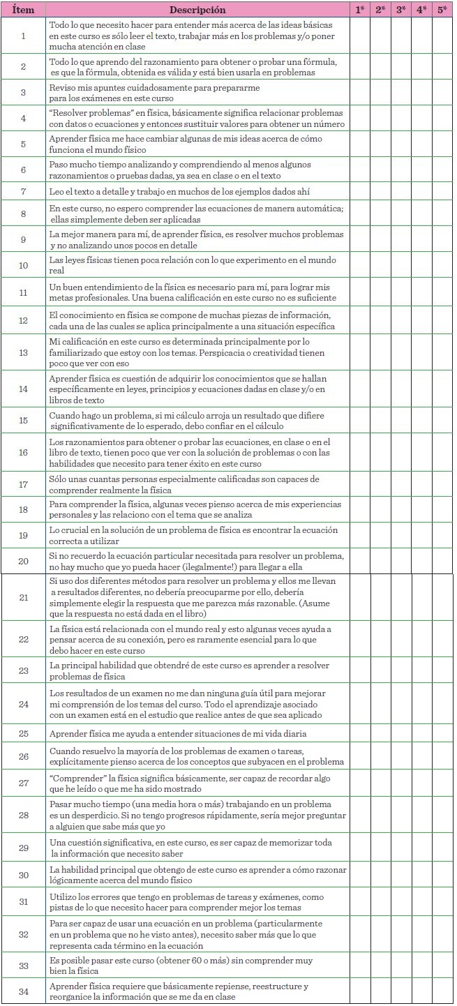 Para conocer las actitudes hacia la física, fue utilizada una versión traducida de la encuesta sobre expectativas hacia la física (MPEX, por sus siglas en inglés: Maryland Physics Expectations Survey), que consta de 34 ítems con 5 opciones de respuesta (Tabla 3) (https://docs.google.com/forms/d/e/1FAIpQLSdhRPyV2yKKse6IYwxt_xaCv_BiOKfua2YOQIbZzPHK0_qRg/viewformhttps://d32ogoqmya1dw8.cloudfront.net/files/NAGTWorkshops/assess05/activities/MPEX.pdf), cuyas respuestas utilizan una escala Likert. La escala fue aplicada también en dos momentos (previo y posterior a la instrucción). Las respuestas emitidas por los estudiantes se compararon con las respuestas emitidas por los expertos en el tema, las cuales son incluidas en el cuestionario para dar certeza del conocimiento que se debe alcanzar (Redish y col., 1997).