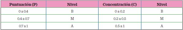 El factor de concentración (C) toma valores entre 0 y 1 y se utiliza para conocer tendencia por elegir una o varias opciones de respuesta, en pruebas de opción múltiple. Cuando el análisis incluye la fracción de aciertos hechos por los estudiantes o puntuación (P), se puede advertir la forma en que evoluciona la comprensión de conceptos. Los valores que arrojan el factor de concentración y la fracción de aciertos (puntuación), se pueden clasificar (Tabla 4) como bajo (B), medio (M) y alto (A). Respecto a la elección de los niveles del factor de concentración Bao y Redish (2001: 47), parten de las posibles distribuciones de las respuestas, en una prueba con cinco opciones de respuesta. Ellos identifican tres tipos de distribución: uno con el mismo porcentaje de respuestas, 20 cada uno (0.2), una situación aleatoria, correspondiente con una concentración baja; un segundo tipo con la mitad de las respuestas concentrada en una opción (50 % o 0.5), correspondiente con una concentración media y un tercero con el 100 % de las respuestas en una sola opción, considerando como una concentración alta. Las distintas combinaciones entre los valores obtenidos de las fracciones de respuesta correcta y el factor de concentración, a su vez, pueden ser clasificados en patrones de respuesta, con los cuales se puede identificar la preferencia por uno, dos o ningún modelo de respuesta (Tabla 5). Así, por ejemplo, un patrón BB indica que se tienen puntuaciones bajas con una concentración de respuestas bajas; es decir, que las opciones de respuesta que tienen frecuencias muy similares, fueron elegidas en igual número por los estudiantes que respondieron a la prueba. Dicho de otra manera, un comportamiento aleatorio. Ello, puede ser, debido a causas como: 1) que los estudiantes en realidad no conocen la respuesta (lo que implica una deficiente formación, ya sea por responsabilidad del docente, del estudiante o ambos); 2) que responden sin razonar (lo que implica, falta de interés del estudiante al momento de responder la prueba, un indicador de ello puede ser el tiempo que tardan en responder los 30 ítems). Así mismo, un patrón BM indica que la puntuación es baja con una concentración media; es decir, las respuestas se concentran en dos opciones principalmente, pero esas dos opciones son incorrectas (de ahí la puntuación baja).