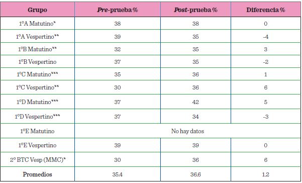 Los datos obtenidos a partir de la aplicación de la MPEX se resumen en la Tabla 6. Como se puede observar, hay un incremento del 1.2 %, de manera general en las respuestas favorables hacia la física. Sin embargo, hubo una disminución de la pre-prueba a la post-prueba de la actitud favorable en los grupos 1°A, 1°B y 1°D turno vespertino (T/V), con - 4 %, - 2 % y - 3 % respectivamente, lo cual debe considerarse en la AF, debido a que representan un cambio de respuestas favorables a desfavorables. Los grupos que obtuvieron mayor diferencia en respuestas favorables fueron el 1°C T/V, 1°D turno matutino (T/M) y 2° BTC T/V, cuyos respectivos porcentajes corresponden al 6 %, 5 % y 6 %. Cabe resaltar que aunque era el mismo docente en el 1°A T/M con el 2° BTC T/V, no hubo ganancia en la actitud favorable hacia la física en el primer grupo, mientras que en el segundo, se registró una ganancia de 6 %; caso similar se reportó en el 1°A T/V y el 1 °C T/V, donde también compartían el docente, sin embargo, mientras que en el primer grupo disminuyó la actitud favorable hacia la física (- 4), en el segundo sí hubo ganancia (6 %). El grupo 1°E T/M no estaba disponible cuando se aplicaron las post-pruebas, por lo que, ellos y los demás estudiantes que no completaron ambas, no fueron considerados para el estudio.