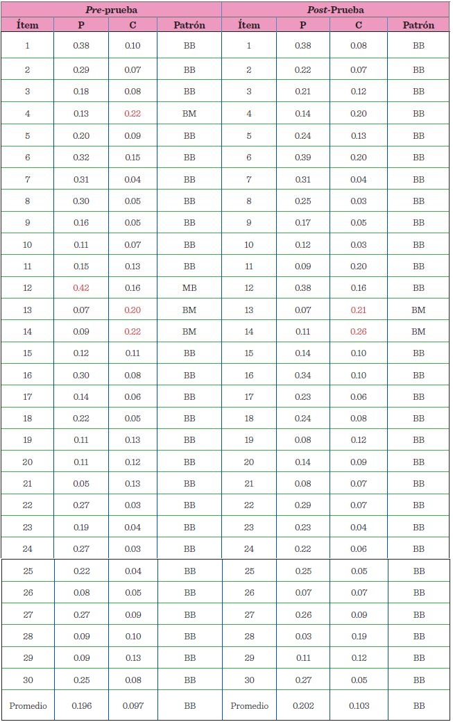 Con la aplicación del FCI como pre y post-prueba se contó con la información necesaria para realizar el análisis de concentración. La Tabla 7 muestra los datos obtenidos de la aplicación y las codificaciones correspondientes, para el total de los cuestionarios aplicados. Con base en ella, en la pre y post-prueba se tuvo una mayor incidencia del patrón BB, excepto por los ítems 4 (Acción y reacción), 12 (Cinemática), 13 (Diagrama de cuerpo libre) y 14 (Cinemática) de la pre-prueba con patrón BM; en la post-prueba se registró en el patrón BM en los ítems 13 y 14. Como se comentó anteriormente y con base en la Tabla 5, un patrón BB indica que hay aleatoriedad en las respuestas, BM indica la posibilidad de la existencia de dos modelos de respuesta incorrectos.