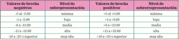 Se dividieron los datos de los actores noticiosos según su género, en mujeres y hombres; y en grupos de edad, de 0 a 19 años, de 20 a 29 años, de 30 a 44 años, de 45 a 59 años y mayores de 60 años. También se determinó si existió la imagen y la voz del actor noticioso, y se establecieron tres esferas de participación: la esfera política, con las categorías de gobernantes, parlamentarios, políticos y poder judicial; la esfera ciudadana, con las categorías de ciudadanos y empresarios; y otras esferas, con las categorías de religión e internacionales. La edad se adjudicó a través de la percepción de voz, imagen y contenido de la noticia. En cada una, se midieron las brechas de género, edad, imagen y voz en la nota informativa. Para categorizar el nivel de representación de los actores noticiosos con respecto al nivel población del grupo de edad y género, se consideró -representación cuando el nivel de representación de los actores noticiosos estaba por debajo del nivel poblacional, y se utilizaron números negativos para indicarlo; y se consideró sobrerrepresentación cuando el nivel de representación de los actores noticiosos estaba por arriba de la tasa poblacional, y se aplicaron números positivos para señalarlo. Se evaluaron estas brechas (con sus números negativos y positivos) como mínima debajo del 0 al 0.99, baja del 1 al 5.99, media del 6 al 10.99, alta del 11 al 15.99 y muy alta del 16 al 20 o superior (Tabla 1).