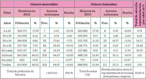 En el noticiero Visión Informativa, la brecha total de los hombres tuvo una sobrerrepresentación muy alta de 16.82 %, ya que ellos representaban el 48.05 % de la población de Morelos y en las notas fueron representados con el 64.87 % de los actores sociales masculinos. Es interesante ver que la situación es contraria en el caso de las mujeres, donde existió una brecha total de subrepresentación general de 16.83 %, ya que representaban el 51.94 % de la población morelense, y solo ocuparon el 35.11 % del contenido informativo del noticiero Visión Informativa. El INEGI (2015b), reporta una porción poblacional del 0.03 % de hombres y del 0.04 % de mujeres sin especificación de edad, lo cual se consideró para el índice poblacional. Pero, todos los actores noticiosos estudiados fueron clasifi cados según su segmento de edad. La brecha absoluta entre la sobrerrepresentación de hombres y la subrepresentación de las mujeres en las noticias fue de 33.65 %, con dominan cia masculina, lo que indicó falta de calidad informativa (Tabla 2).