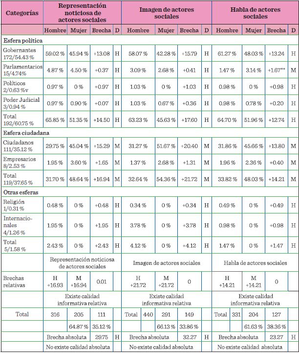 Existió calidad informativa relativa, porque la distancia entre las brechas totales de representación noticiosa de actores sociales, según el género, tuvo una brecha mínima de 0.01. En imagen y habla la brecha total fue de cero (Tabla 3). Los hombres dominaron las esferas de actuación noticiosa de la política y otras esferas; y las mujeres dominaron la esfera ciudadana.