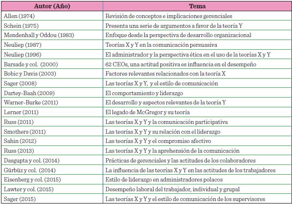 Los supuestos que McGregor presentó, dejaron muchas ideas para hacer investigación y seguir analizando, revisando y discutiendo el tema desde diversas perspectivas. Aunque en el momento en que se dio a conocer no había muchas directrices ni validaciones realizadas, con el paso del tiempo empezaron a aparecer aportaciones interesantes, tal como se muestra en algunos trabajos realizados sobre el tema (Tabla 1).